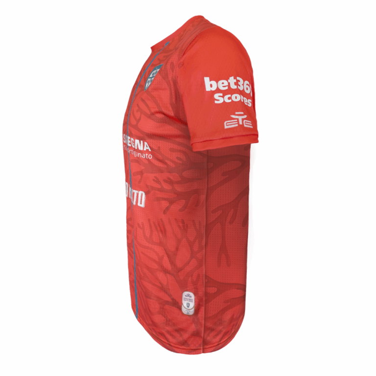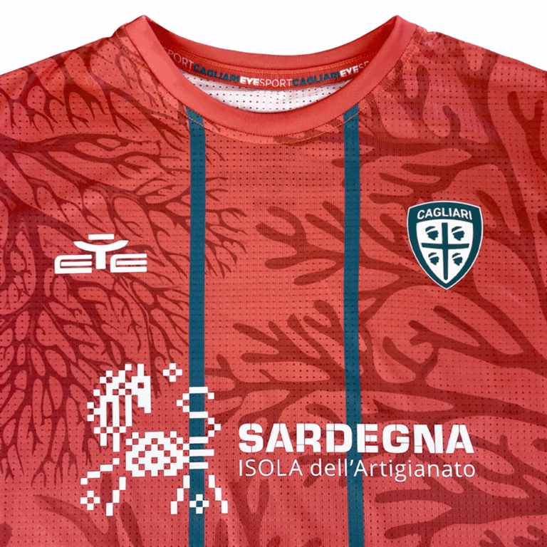 Il design trae ispirazione dal corallo del Mediterraneo: righe verticali a contrasto raccontano la forza che si cela nelle profondità marine. Realizzata in poliestere Dimple da filato certificato Repreve® di origine riciclata, con maniche in Round Mesh, unisce performance e sostenibilità. Sul fronte, lato cuore, lo scudetto del Club; sul lato opposto il logo EYE Sport. Entrambi sono in silicone di ultima generazione, più leggeri del 70%. Sul fianco sinistro, in basso, il tag NFC rende ogni capo unico e riconoscibile. Il colletto e il bordo maniche in costina donano compattezza al design, mentre all’interno il tergisudore personalizzato riporta le scritte “Cagliari” ed “EYE Sport”.