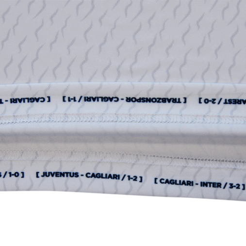 Divisa realizzata con materiali ecocompatibili e che allo stesso tempo garantiscono leggerezza, traspirabilità e libertà di movimento. Il colore predominante è il bianco con richiami alla Sardegna dati dalle onde del mare riportate attraverso una trama – stampata a sublimazione – con un effetto anni novanta. Il “kit-away” celebra i 30 anni dall’epica cavalcata dei rossoblù in Coppa Uefa (1993/1994) sia attraverso il design, sia tramite il dettaglio con i risultati delle varie gare giocate nella competizione.