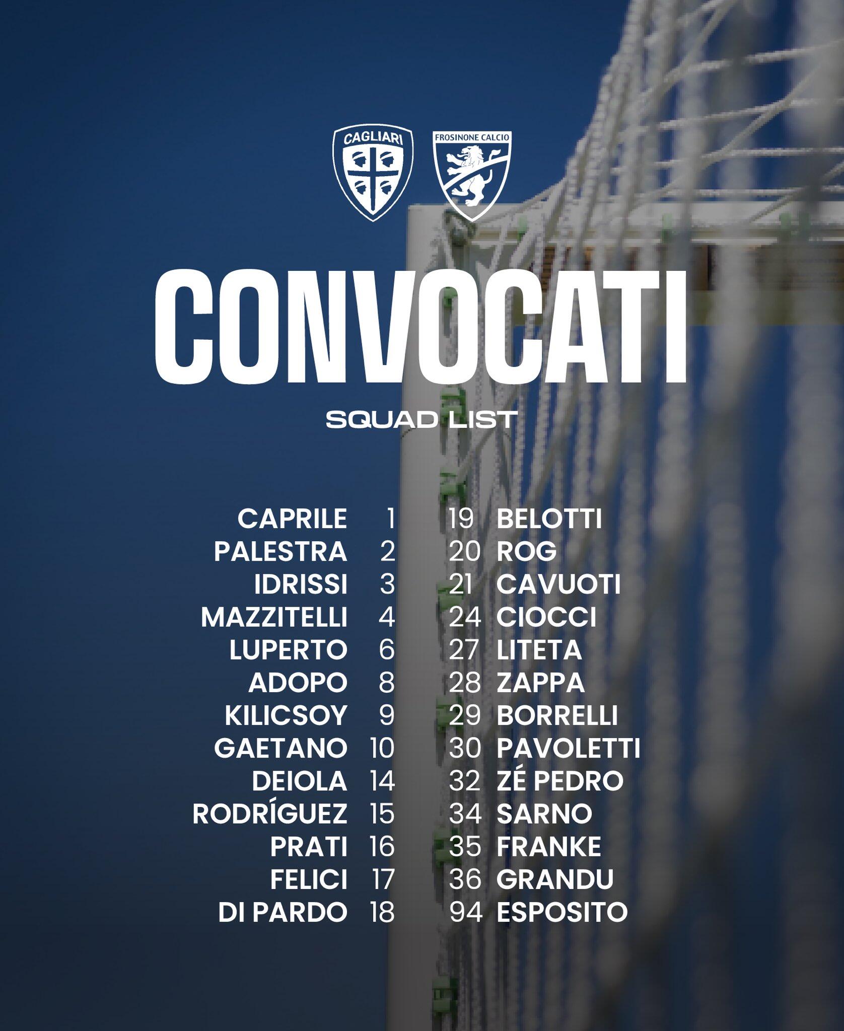 Come anticipato dallo stesso tecnico rossoblù, resteranno a riposo per gestire i carichi tre dei titolari di Lecce Yerry Mina, Adam Obert e Michael Folorunsho: oltre ai tre, saranno assenti gli infortunati Zito Luvumbo, Boris Radunovic e Nicola Pintus. Ci sarà , come a Lecce, anche Leonardo Pavoletti. Insieme al terzo portiere Sarno, saranno chiamati dall’Under 20 di Francesco Pisano anche il difensore Antoni Franke, l’esterno Nicola Grandu e il centrocampista zambiano Joseph Liteta. Di seguito la lista nella grafica pubblicata dal club rossoblù.