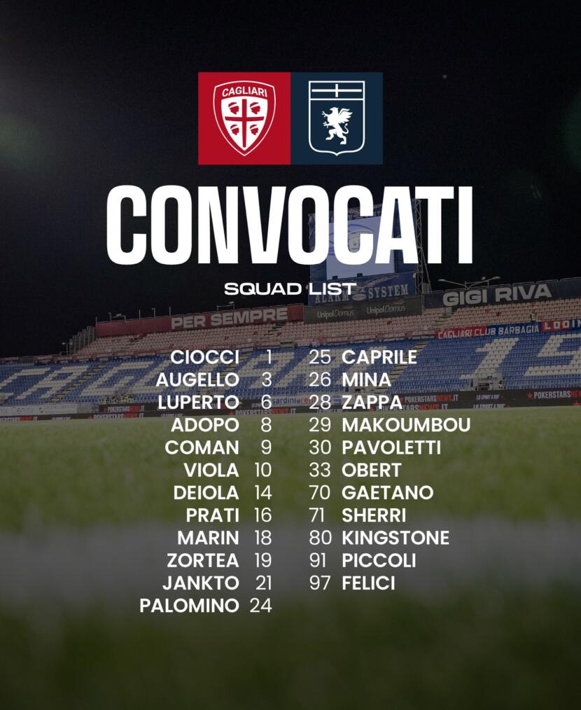 Dopo la seduta di rifinitura nel ritiro di Asseminello sono stati ufficializzati i giocatori a disposizione del tecnico rossoblù per la sfida alla squadra di Vieira. Non sarà della partita Zito Luvumbo, infortunatosi contro il Bologna: per l’angolano una distrazione di basso grado al bicipite femorale della coscia destra, problema che lo terrà fuori almeno tre settimana. Ritorna in lista Kingstone Mutandwa dopo aver saltato le ultime due partite in seguito a una contusione al ginocchio. Di seguito nella grafica del club rossoblù la lista dei giocatori a disposizione.