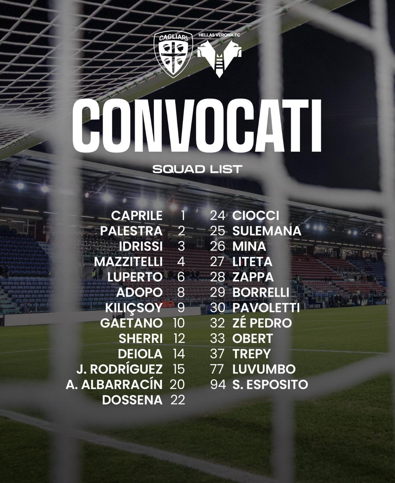 Prima chiamata per Agustìn Albarracìn anche se il transfer per poterlo schierare in Serie A potrebbe non arrivare in tempo: il giocatore uruguaiano ha scelto la maglia numero 20. Torna tra i convocati dopo quasi un mese Alessandro Deiola: il centrocampista sangavinese era fuori per una lesione al retto femorale della coscia destra, ma andrĂ comunque in panchina con i compagni. Non c’ Nicola Pintus, messo fuori causa da un affaticamento all’adduttore. Assente anche Prati ovviamente, per cui si aspetta solo l’ufficialitĂ per il suo passaggio al Torino. Ancora out i lungodegenti Michael Folorunsho, Andrea Belotti e Mattia Felici. Di seguito, nella grafica del club rossoblĂą, la lista completa dei convocati.