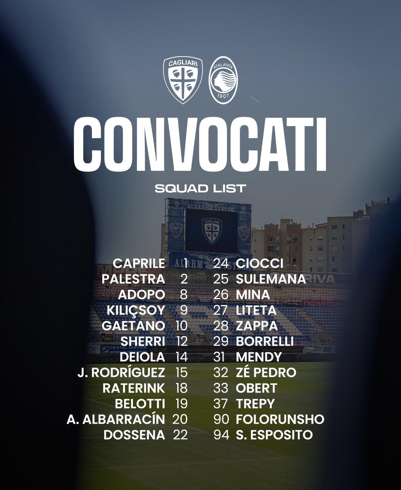 Sono ventiquattro i convocati di Fabio Pisacane per la partita del Cagliari contro l’Atalanta, valida per il 34° turno del campionato di Serie A.