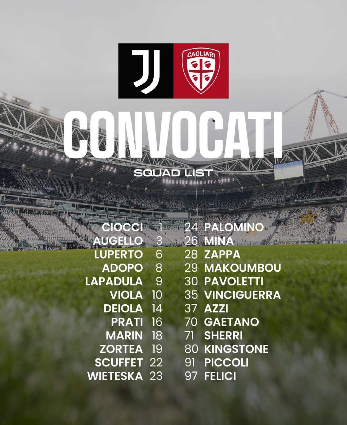 Come anticipato nelle parole della vigilia di Davide Nicola, Zito Luvumbo non fa parte della lista dei convocati. L’angolano ha rimediato una distorsione alla caviglia nell’ultima gara contro l’Atalanta in seguito a uno scontro con De Roon che l’aveva costretto ad alzare bandiera bianca venendo sostituito da Felici. Luvumbo sarà rivalutato in queste ore con nuovi esami, con la speranza che il problema non sia più grave. Assenti anche Jakub Jankto e Adam Obert: il difensore slovacco ha la febbre e non è idoneo per la partita della Juventus. Convocato da Davide Nicola anche il capitano della Primavera Alessandro Vinciguerra che vestirà la maglia numero 35. Nella grafica del Cagliari Calcio la lista completa dei convocati.