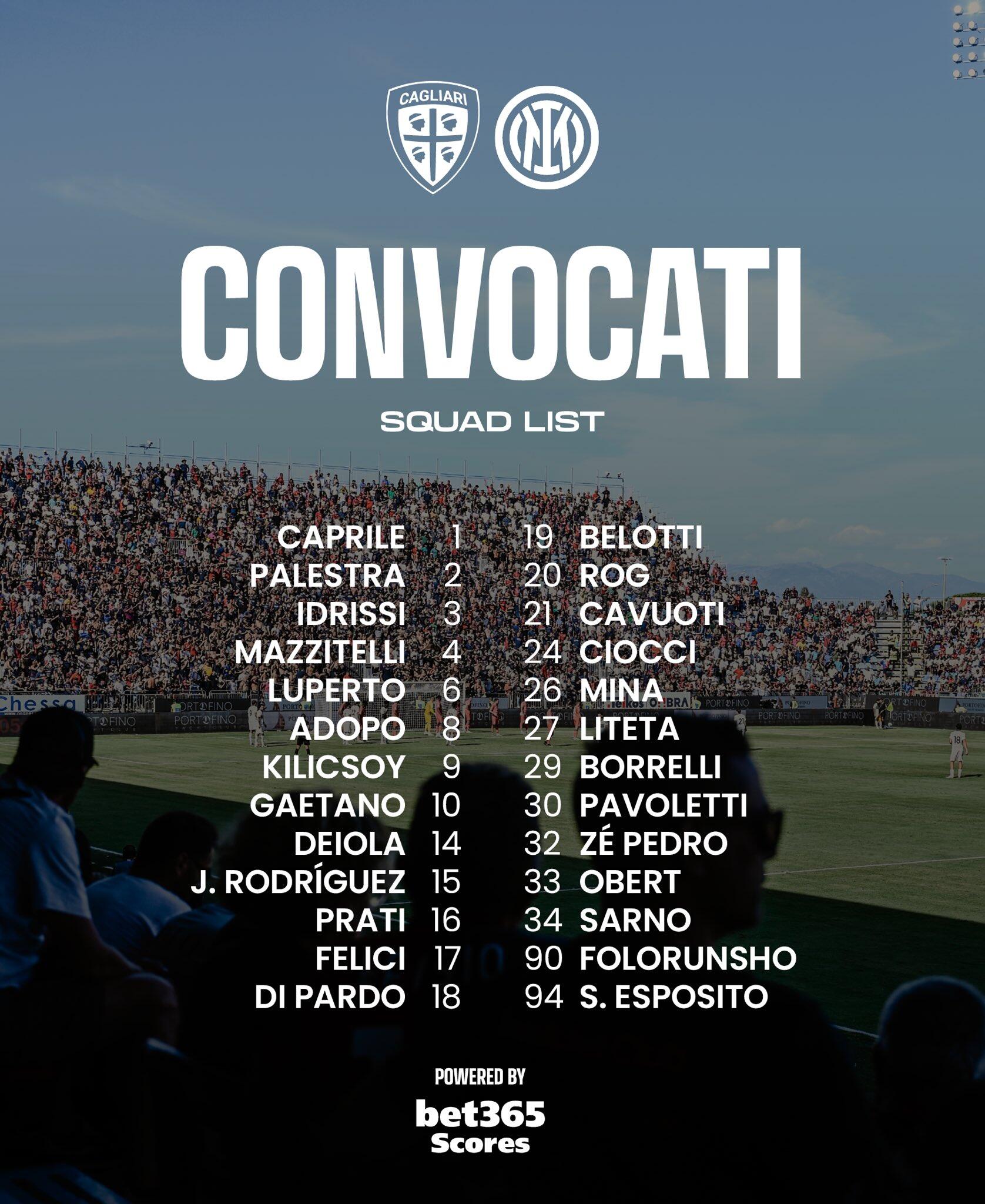 Il tecnico dovrà fare a meno degli infortunati Boris Radunovic, Nicola Pintus e Zito Luvumbo, con l’angolano che ha lavorato in gruppo nella giornata di ieri per la prima volta dopo il problema accusato nella precedente sosta nazionale, ma sarà arruolabile soltanto dopo questa gara. Sarà out anche Gabriele Zappa, uscito prima della fine del primo tempo nella gara di Coppa Italia per un risentimento al retto femorale della coscia sinistra che lo costringerà a tornare dopo la sosta. Dalla Primavera convocati il portiere Sarno e Liteta. Di seguito nella grafica ufficiale del club rossoblù la lista completa dei convocati.