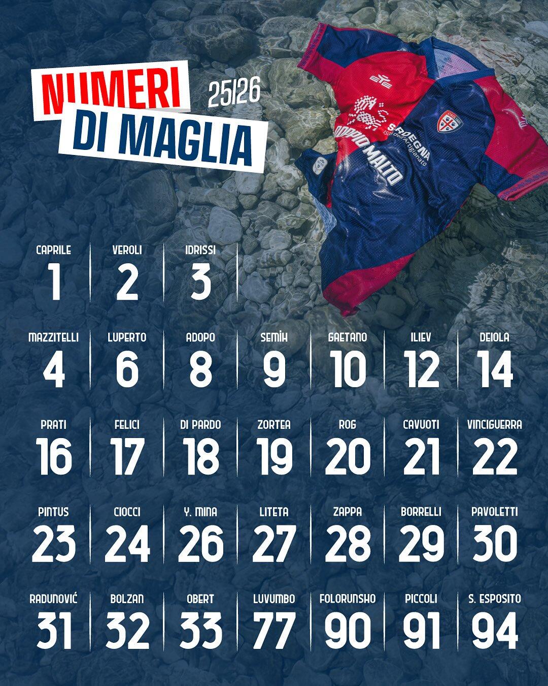 Tra gli altri ex Primavera Idrissi ha scelto la maglia numero 3, Pintus la 23, Liteta la 27, Bolzan la 32 e Vinciguerra mantiene la 22. Tra i nuovi acquisti, la 9 è il numero scelto da Kilicsoy, la 29 a Borrelli, la 4 a Mazzitelli, la 90 a Folorunsho e il 94 Esposito, scelto in onore della struttura in cui è cresciuto calcisticamente a Castellammare di Stabia. Tra i ritorni Radunovic prende la 31, maglia indossata alla prima avventura a Cagliari, e Marko Rog la numero 20.