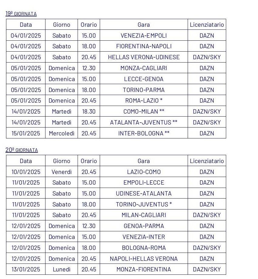 Attraverso un comunicato sui propri profili ufficiali pubblicato nella giornata di oggi, venerdì 1° novembre, la Lega Serie A ha reso note date, orari e programmazione televisiva del diciannovesimo e del ventesimo turno della competizione.