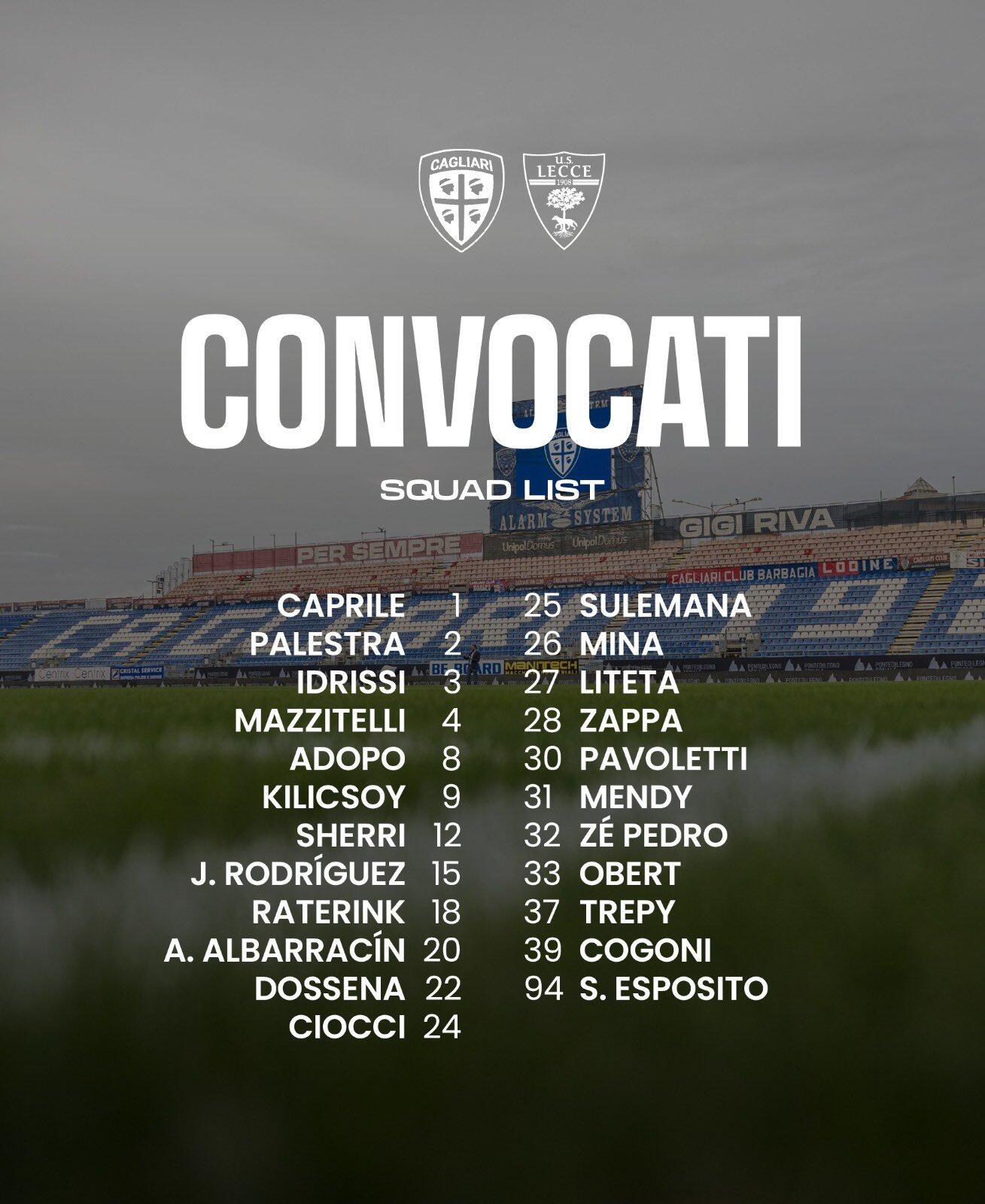Non prenderanno parte al match anche Alessandro Deiola, Gennaro Borrelli e Michael Folorunsho, prossimo al rientro, oltre ai lungodegenti Mattia Felici e Andrea Belotti. È in lista Zé Pedro, che proverà un recupero last minute per essere a disposizione contro i salentini. Dalla Primavera arrivano in supporto della Prima Squadra il difensore Andrea Cogoni e l’attaccante Paul Mendy, già convocato da Pisacane nel match dell’Olimpico contro la Roma.