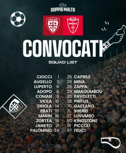 Sono ventiquattro i convocati da Davide Nicola per la sfida tra Cagliari e Monza in programma domani, domenica 30 marzo alle ore 12.30 alla Unipol Domus.