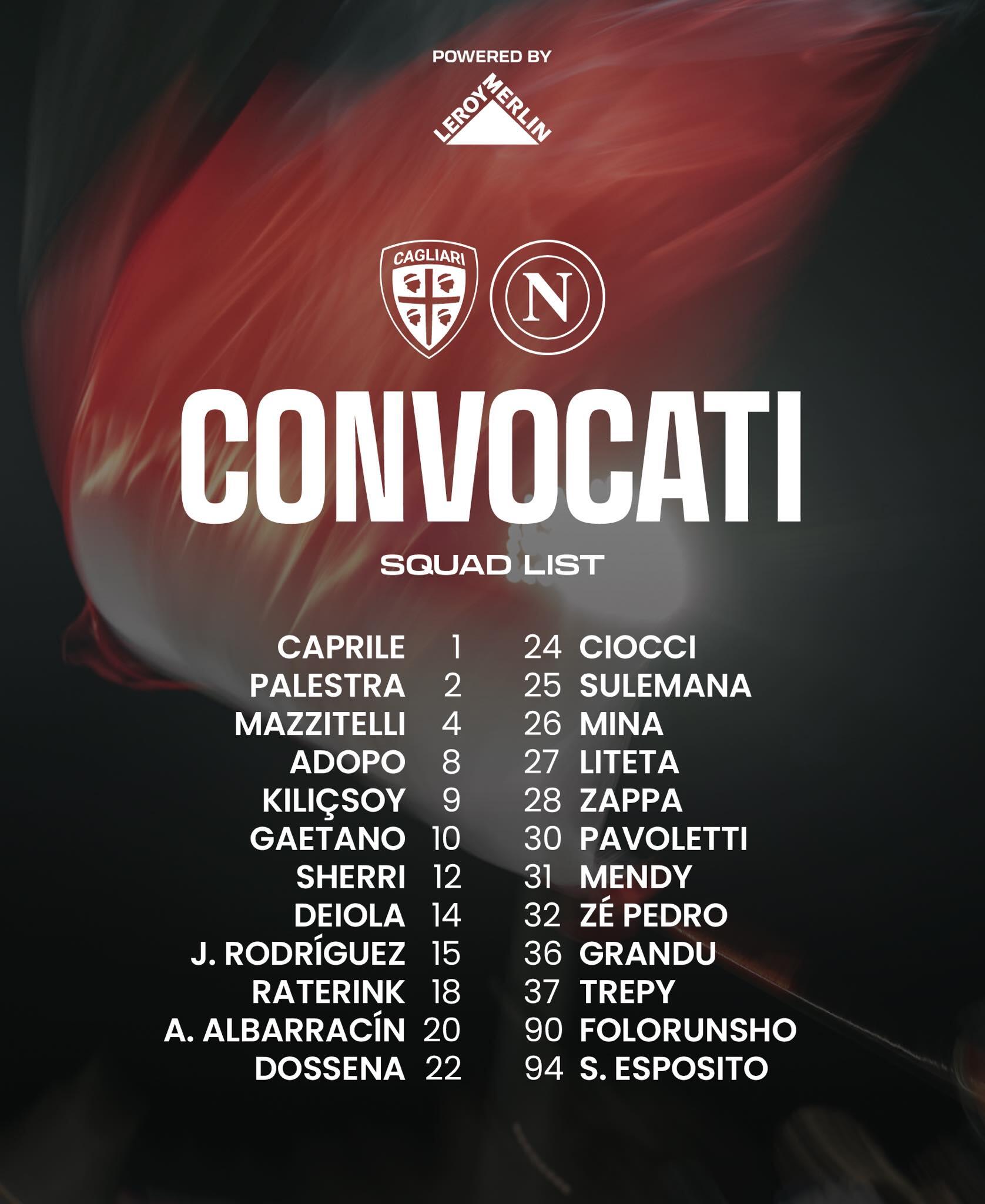 Della lista fa parte anche Joseph Liteta nonostante, come anticipato dallo stesso tecnico in conferenza stampa, abbia subìto una contusione alla caviglia. Come per la partita di Pisa saranno a disposizione Yerry Mina, Gianluca Gaetano, Luca Mazzitelli e Alessandro Deiola, mentre non ci sarà lo squalificato Adam Obert. Fuori anche i lungodegenti Borrelli, Felici, Belotti e Idrissi. Dall’Under 20 di Gallego chiamati Paul Mendy e Nicola Grandu, rientra dalla squalifica scontata a Pisa Sebastiano Esposito. Di seguito nella grafica del club rossoblù la lista completa dei convocati.