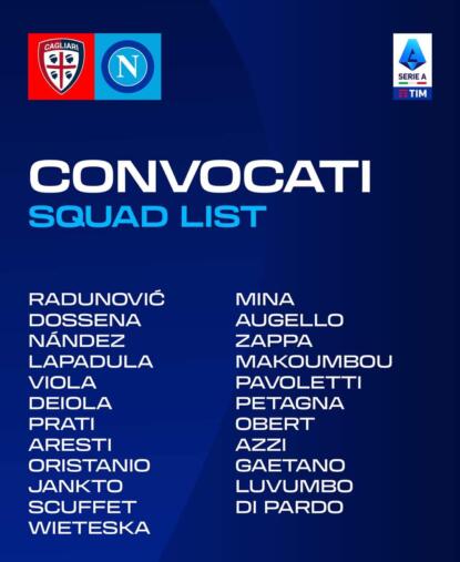 Per la sfida contro i partenopei dell’ex Francesco Calzona, l’allenatore rossoblรน ritrova Gaetano Oristanio ma non Ibrahim Sulemana, che non recupera dal risentimento muscolare. Out anche Eldor Shomurodov (che in settimana ha cominciato ad allenarsi in personalizzato), cosรฌ come i lungodegenti Marco Mancosu e Pantelis Hatzidiakos. Tra i giocatori chiamati da Ranieri c’รจ anche Nahitan Nandez, inizialmente in panchina nella sfida contro l’Udinese per un affaticamento e poi entrato a gara in corso. Di seguito la lista completa.