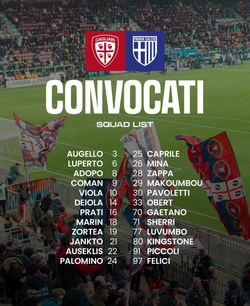 Sono ventiquattro i giocatori convocati da Davide Nicola per la partita tra Cagliari e Parma in programma domenica 9 febbraio alla Unipol Domus (ore 15.00).