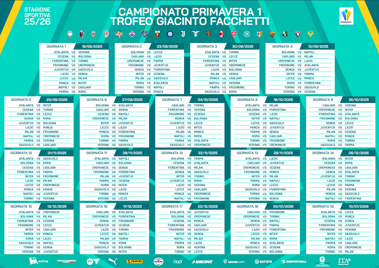 È stato ufficialmente comunicato il calendario del campionato Primavera 1, trofeo Giacinto Facchetti, che partirà il prossimo 16 agosto 2025, con la regular season che si chiuderà il 16 maggio prima di fare spazio ai playoff scudetto e ai playout.