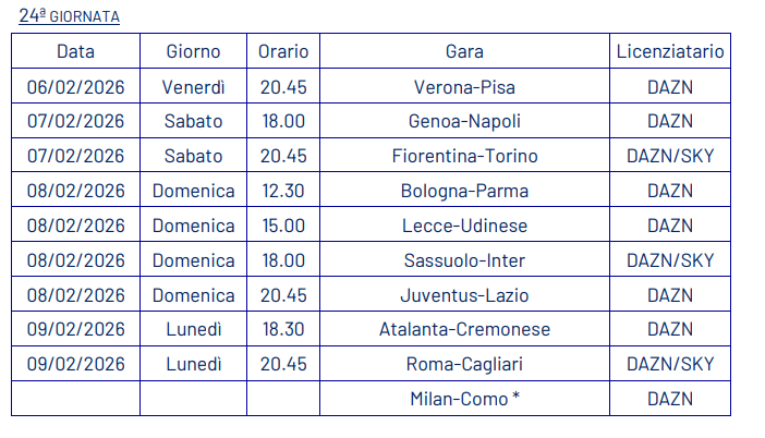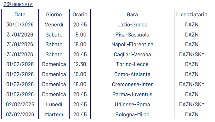 Tramite una nota pubblicata sul sito ufficiale, la Lega Serie A ha reso note date e orari delle partite di campionato valide per la 23ª e 24ª giornata, che vedranno il Cagliari sfidare il Verona all’Unipol Domus e la Roma all’Olimpico.