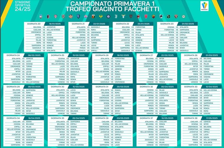 Anche quest’anno, per il massimo campionato Under 19, il calendario sarà sfalsato tra girone d’andata e ritorno. In vista della prossima Primavera 1 2024-2025 il nuovo Cagliari Primavera di Pisacane avrà un inizio certamente non semplice. I sardi infatti, alla prima giornata di campionato, affronteranno fuori casa la Roma, vice campione dell’ultima Primavera 1 e che ha perso in finale contro il Sassuolo. La prima gara interna della stagione in quel di Asseminello, invece, sarà alla seconda di campionato contro il Monza, sfida questa che sarà seguita da due esami importanti – fuori casa – contro l’Hellas Verona e tra le mura amiche contro l’Inter. Il Cagliari Primavera, che ripartirà da un gruppo consolidato – qui il nostro approfondimento – ma con degli addii eccellenti (su tutti quelli di capitan Carboni e del suo vice Idrissi), chiuderanno la prima parte di stagione l’11 gennaio contro una delle neopromosse di questa Primavera 1 ovvero la Cremonese. Il girone di ritorno, salvo diverse indicazioni nel corso dell’annata, prenderà il via sette giorni dopo, il 18 gennaio, in casa contro l’Hellas Verona. La fase regolare del campionato di Primavera 1 si concluderà il 17 maggio, con gli isolani che nelle ultime quattro giornate di campionato avranno altrettanti impegni insidiosi contro Sassuolo, Bologna, Atalanta e Udinese, quest’ultima risalita in Primavera 1 dopo appena una stagione in Primavera 2. Di seguito il calendario completo.