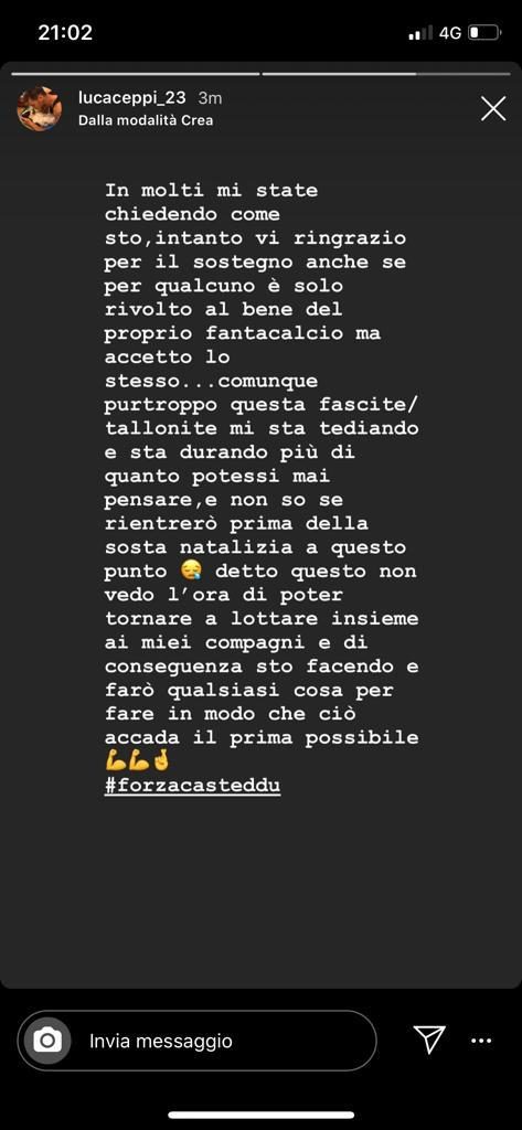 Luca Ceppitelli attraverso una Instagram Stories ha voluto avvisare tifosi e appassionati di fantacalcio. “Questa fascite/tendinite mi sta tediando e sta durando più di quanto potessi pensare. Non so se rientrerò prima della sosta natalizia a questo punto. Non vedo l’ora di tornare e lottare insieme ai compagni”