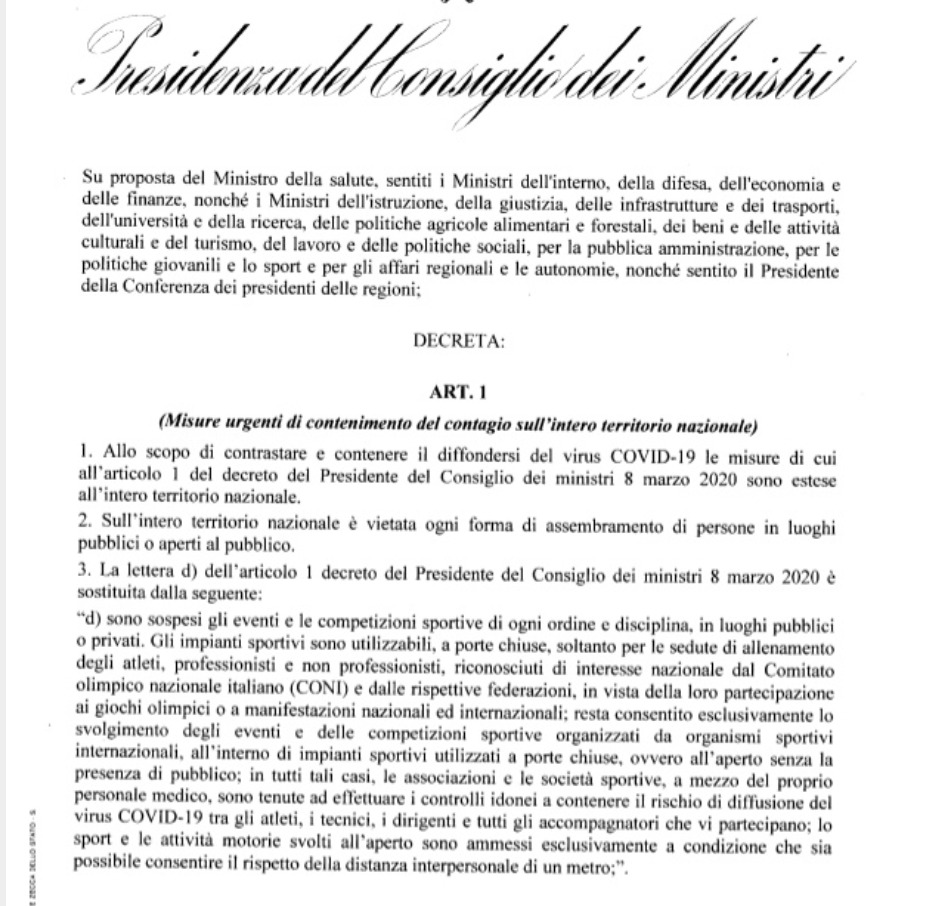 AGGIORNAMENTO DELLE 23.50 – Nel decreto firmato dal premier Conte, però, è presente l’eccezione per lo svolgimento degli eventi sportivi internazionali (Champions League, Eurolega etc.), purché a porte chiuse: “Gli impianti sportivi sono utilizzabili, a porte chiuse, soltanto per le sedute di allenamento degli atleti riconosciuti di interesse nazionale dal CONI e dalle rispettive federazioni, in impianti chiusi al pubblico; sarà inoltre consentito disputare, sempre a porte chiuse, eventi e competizioni sportive internazionali. Salvi quindi i prossimi impegni di Champions ed Europa League, in attesa di eventuali nuove comunicazioni da parte del CONI, della FIGC o della UEFA”.