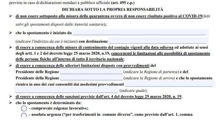 La principale novità risiede nella nuova sezione che stabilisce che il dichiarante conosce le nuove limitazioni imposte dal presidente della Regione di appartenenza e in quella in cui ci si dovrebbe spostare. Rimangono invariate le sezioni specificare i luoghi da cui parte e arriva lo spostamento da effettuare, dopo la restrizione del decreto di divieto di cambio comune a meno di comprovate esigenze, così come quelle riservate al dichiarante che assicura di non essere sottoposto alla misura della quarantena e di non essere risultato positivo al virus COVID-19 e i motivi consentiti per gli spostamenti, ovvero lavoro, salute, necessità e rientro presso il proprio domicilio o residenza. Vi saranno dei controlli lungo la viabilità principale e nelle stazioni ed aeroporti: la veridicità dell’autodichiarazione sarà stabilita con successivi controlli.