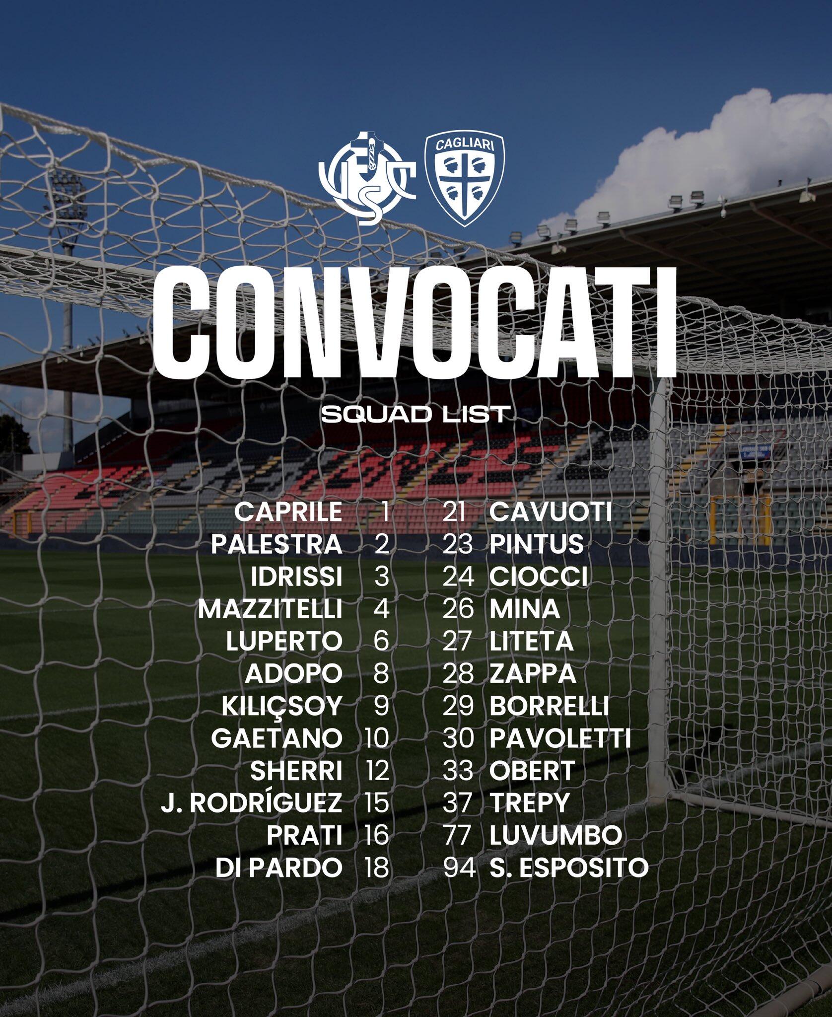Sono ventiquattro i convocati da Fabio Pisacane per la partita del Cagliari contro la Cremonese in programma domani, giovedì 8 gennaio, e valida per l’ultima giornata del girone d’andata della Serie A.