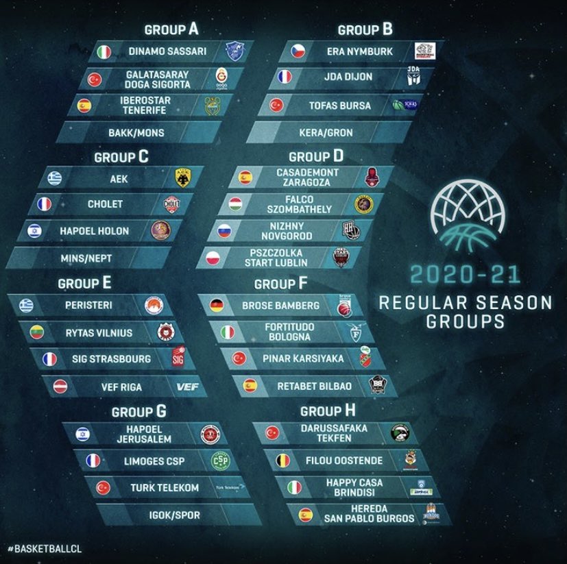 La Dinamo Banco di Sardegna Sassari è stata inserita nel Gruppo A insieme a Tenerife, Galatasaray, e la vincitrice del preliminare tra i danesi Bakken Bears e i belgi del Mons. Sarà mantenuto il calendario per cui si gioca di martedì e mercoledì, così da non impattare sul regolare svolgimento delle leghe nazionali: da ottobre a gennaio saranno disputate dodici sfide BCL, garantendo due settimane tra una partita e l’altra per le squadre di uno stesso girone. Le squadre giocheranno sei match (tre gare in casa e tre in trasferta), con le due migliori che passeranno alla fase successiva il cui format sarà concordata seguendo l’evoluzione della pandemia: un girone scomodissimo per i ragazzi di Gianmarco Pozzecco che affronteranno i turchi e gli spagnoli, due tra i club maggiori indiziati anche per un eventuale Final Four. La composizione dei gruppi è stata stilata tenendo conto dei sorteggi che si sono tenuti a luglio e le squadre sono state divise sulla base del seed e alle urne in cui erano state inserite. La prima palla a due è per il 20-21 ottobre.