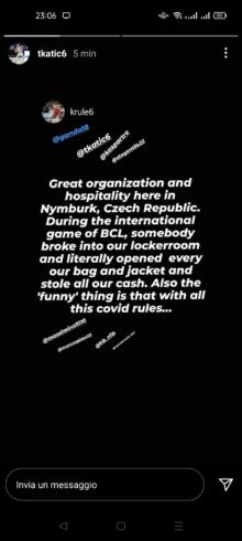 Alcune persone sarebbero entrate negli spogliatoi del Palazzetto dello Sport della cittadina ceca per derubare la squadra ospite. A segnalare il fatto è stato Kruslin sui suoi social: “Grande organizzazione e ospitalità a Nymburk. Durante la partita qualcuno è entrato nei nostri spogliatoi aprendo tutte le nostre borse e giubbotti derubandoci di tutti i contanti. La cosa buffa è che è successo con tutte le regole sul covid, qui è tutto chiuso e non puoi andare da nessuna parte e c’erano una sessantina di persone ammesse nel palazzetto…”.