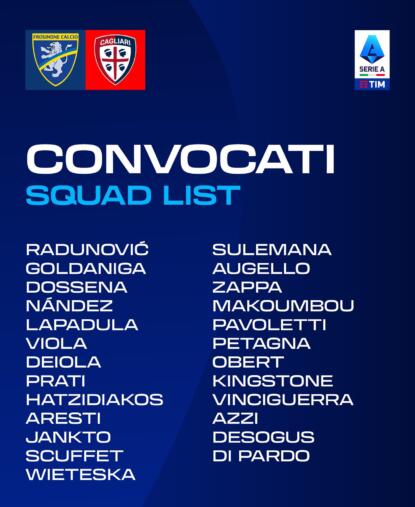 Allenatosi a parte e poi parzialmente in gruppo, il numero 9 rossoblù ha recuperato per l’importante scontro diretto contro i ciociari di Eusebio Di Francesco dal problema alle costole subìto alla fine dell’anno solare. Tra gli attaccanti confermati i due Primavera Kingstone Mutandwa e Vinciguerra, mentre non sarà della partita Marco Mancosu.Fuori dalla lista anche Capradossi che va verso la risoluzione del contratto.