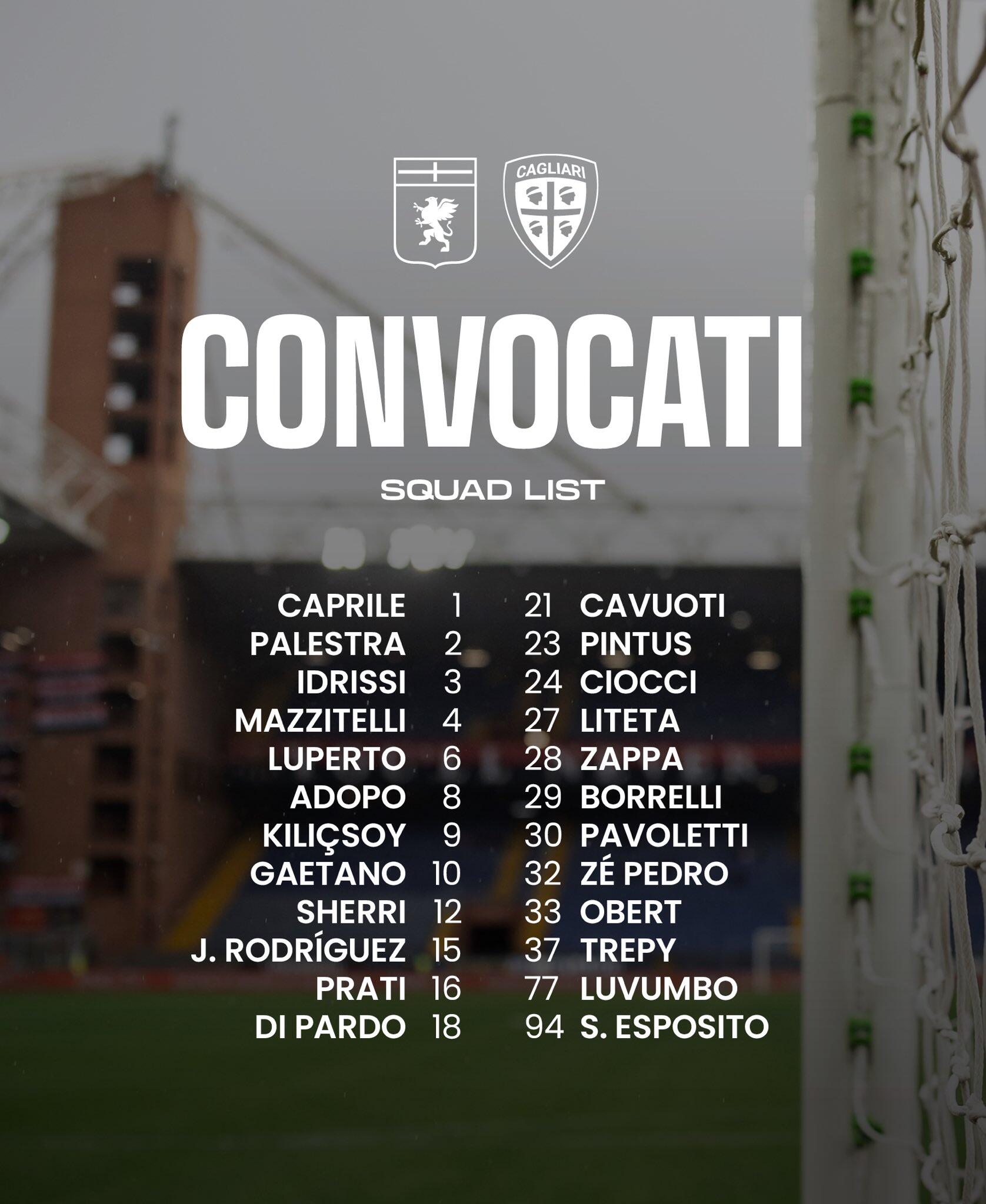 Sono ventiquattro i convocati da Fabio Pisacane per la partita del Cagliari contro il Genoa in programma al Ferraris domani, lunedì 12 gennaio alle ore 18.30.