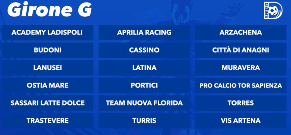 Arzachena Academycs, Budoni, Lanusei, Muravera, Sassari Latte Dolce e Torres sono state come di consueto inserite nello stesso raggruppamento (Girone G), insieme alle formazioni laziali e due campane (Portici e Turris): spostate nel Girone E e F, alcune delle formazioni laziali che facevano parte l’anno scorso del girone delle isolane come Albalonga, Atletico Fiuggi (ex SFF) e Flaminia. Ecco la composizione: Academy Ladispoli, Aprilia, Arzachena, Budoni, Cassino, Città di Anagni, Lanusei, Latina, Muravera, Ostiamare, Portici, Pro Calcio Tor Sapienza, Sassari Latte Dolce, Team Nuova Floridia, Torres, Trastevere, Turris, Vis Artena. Le prima giornata fissata per il 1° di settembre.