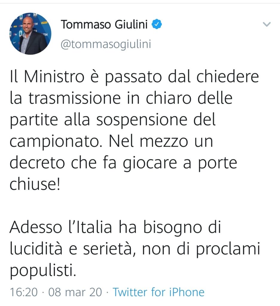 Artraverso un tweet il patron rossoblú ha dichiarato: “Il Ministro è passato dal chiedere la trasmissione in chiaro delle partite alla sospensione del campionato. Nel mezzo un decreto che fa giocare a porte chiuse!Adesso l’Italia ha bisogno di lucidità e serietà , non di proclami populisti”.