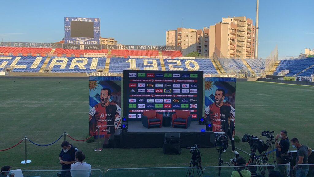 18:28 – Ancora pochi minuti e Diego Godin e Tommaso Giulini calcheranno il terreno della Sardegna Arena per raggiungere le poltrone.