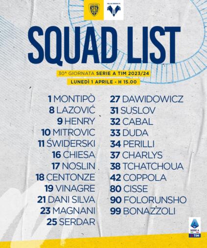 Nella lista convocati di Marco Baroni compaiono anche i nomi di Suslov e Folorunsho: convocazioni non scontate quelle di due dei migliori centrocampisti a disposizione degli scaligeri che potranno risultare utili anche a gara in corso. Recupero lampo, o convocazione per stare vicino ai compagni vista l’importanza della partita, per Suslov con il centrocampista slovacco che si presumeva poter stare fermo anche 3 settimane a causa di un problema alla caviglia sinistra. Ci sarà anche Michael Folorunsho che aveva subìto un risentimento muscolare durante la finestra nazionali con l’Italia di Luciano Spalletti, che non gli aveva permesso di debuttare in maglia azzurra nelle amichevoli con Venezuela ed Ecuador. Di seguito nella grafica la lista convocati completa di Marco Baroni