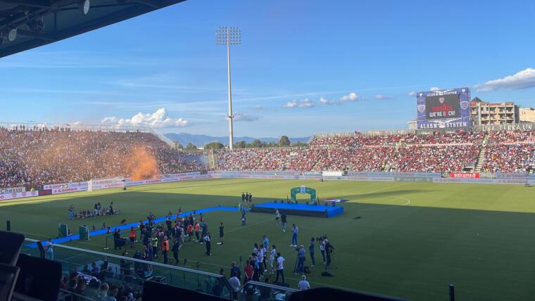 19.02 – Per l’evento in cui verrà consegnata la Coppa e si celebrerà la promozione sono stati aperti i settori dello stadio. Pochi gli spazi rimasti liberi nello stadio rossoblù.