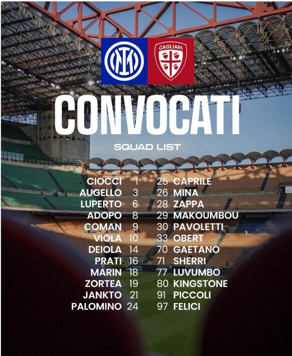 Rosa al completo per il Cagliari che affronterà l’Inter domani, sabato 12 aprile alle ore 18.00 per la 32ª giornata di campionato: Davide Nicola, come nell’ultima gara contro l’Empoli, avrà a disposizione 24 giocatori.
