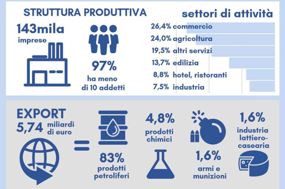 Il 2018 ĆØ il quinto anno consecutivo nel quale le esportazioni di armi sono in crescita: si passa da 76,9 milioni di euro nel 2017 a 94,6 nel 2018. Per i lāindustria casearia ĆØ invece il terzo anno consecutivo di contrazione: da 120,7 milioni di euro nel 2017 a 91,4 nel 2018.