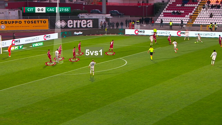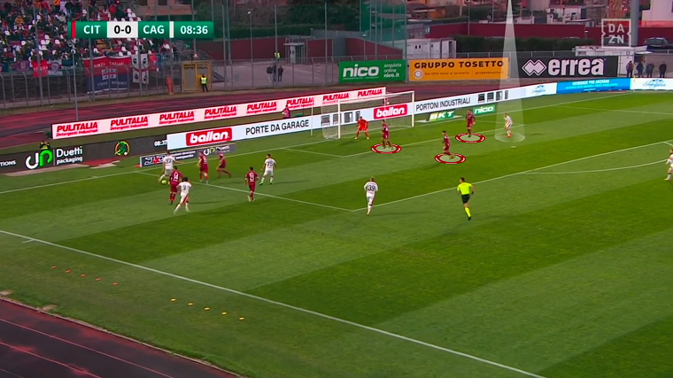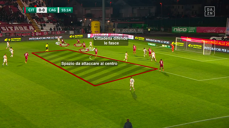 I veneti si sono focalizzati specialmente nel difendere le zone laterali cercando di fare densità, ma questo logicamente portava a lasciare degli spazi centralmente a causa dell’uomo in meno. Il Cagliari, tuttavia, ha rinunciato ad attaccare la zona centrale avendo lasciato i tre difensori in campo, i quali spesso cercavano il lancio dalla trequarti per un Lapadula in area isolato tra i difensori avversari piuttosto che tentare un’azione manovrata. In questo modo il Cagliari ha sprecato il vantaggio di giocare con un uomo in più andando a occupare zone del campo in cui il Cittadella si trovava spesso in superiorità numerica. È risultata inoltre evidente la mancanza di un giocatore in grado di saltare l’uomo, caratteristica fondamentale quando si sfida un blocco così basso, e in questo senso l’ingresso di Luvumbo è apparso alquanto tardivo.