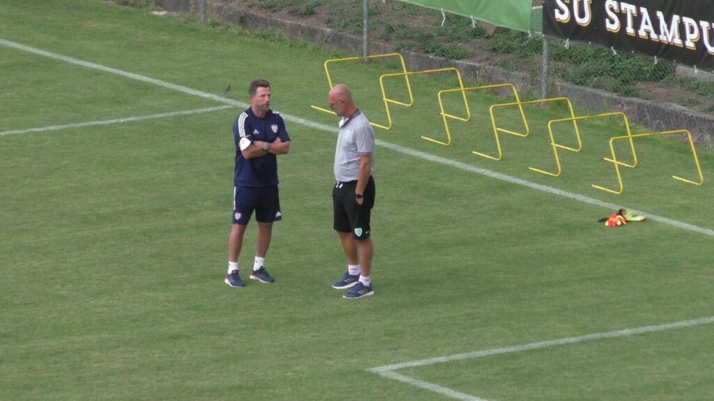 15.50 – Colloquio in campo tra Eusebio Di Francesco e Max Canzi, presente e recente passato del Cagliari; il tecnico all’Olbia ha rivestito il ruolo di vice di Walter Zenga.