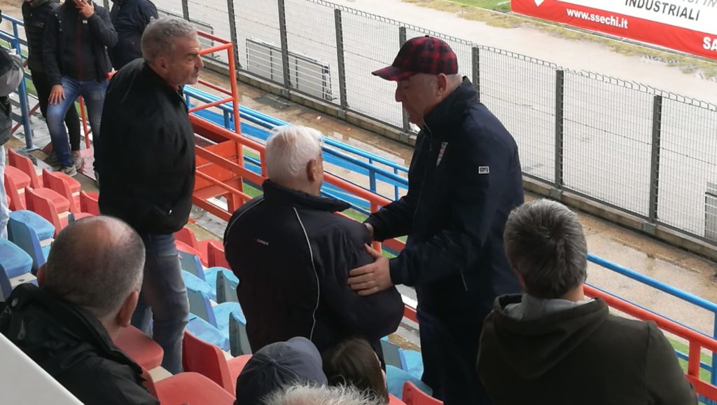 14:28 – In tribuna anche la leggenda torresina Balestri, qui abbracciato dal presidente Salvatore Sechi.
