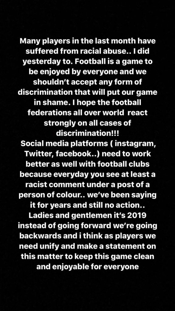 Attraverso una Instagram Stories il belga ha voluto dire la sua sull’argomento: “Molti giocatori nell’ultimo mese sono stati bersaglio di gesti razzisti: ieri li ho subiti anche io. Il calcio è un gioco di cui tutti dovrebbero godere e non è accettabile qualsiasi forma di discriminazione che metta in imbarazzo il football. Spero che le federazioni di tutto il mondo reagiscono. I social media dovrebbero lavorare meglio con i club perché ogni giorno vediamo commenti razzisti sotto post di persone di colore. Lo si dice da tempo, ma nulla è stato fatto. Signore e signori è il 2019 e invece di andare avanti stiamo peggiorando e penso come giocatori che dobbiamo unirci e fare una dichiarazione in materia per mantenere il gioco pulito e apprezzabile per chiunque”.Â