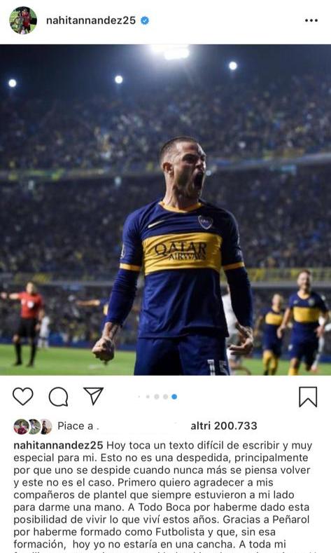 Così Nahitan Nández, fresco di presentazione con la maglia del Cagliari, ha voluto salutare chi prima dei tifosi rossoblù lo aveva eletto quale idolo: “Oggi devo scrivere qualcosa di difficile e molto speciale per me. Questo non è un addio, specie perché uno dice addio quando non pensa di tornare, e questo non è il mio caso. Innanzitutto voglio ringraziare i miei compagni di squadra che mi sono sempre stati accanto per darmi una mano. A tutto il Boca per avermi dato l’opportunità di vivere tutte le emozioni provate in questi anni. Grazie al Penarol per avermi cresciuto come calciatore, senza quella formazione oggi non sarei in campo. Grazie a tutta la mia famiglia e tutti i miei amici per sostenermi sempre. E infine voglio parlare a voi, tifosi del Boca. È complicato descrivere quello che mi avete fatto sentire. Dal primo momento mi avete sostenuto e con il tempo l’affetto è diventato amore. Voglio che sappiate che ogni volta che ho giocato con la maglia del Boca ho giocato per rappresentare voi. Tengo stretto nella mia anima l’ultimo urlo “uruguaiano, uruguaiano” di ieri. È stato un momento che mai dimenticherò. La carriera di un calciatore è corta e spesso bisogna prendere decisioni pensando al futuro e alla famiglia. Però c’è qualcosa che vorrei che sappiate: la vita ci farà rincontrare, le nostre strade si rincontreranno, state sicuri di questo. Arrivai Carbonero, me ne vado carbonero e bostero. Alla prossima vecchio Boca vincitore. Vi amo”.