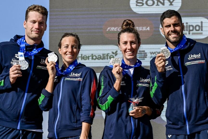 Nella staffetta mista 4×1500 con dodici formazioni al via, ha vinto la Francia che con Logaine Fontaine, trionfatore della generale maschile, che nello sprint finale brucia tutti beffando il quartetto azzurro che con Dario Verani termina a due decimi dai transalpini. Nel convulso finale fatto di traiettorie variabili cede l’Ungheria con l’olimpionico Kristof Rasovsky che chiude al terzo posto. La Francia mischia le carte e alterna uomo e donna ma le variabili non cambiano e si decide tutto allo sprint. Alla fine il quartetto transalpino con Caroline Jouisse, Sacha Velly, Clemence Coccordano e Logaine Fontaine tocca in 1h07’54″0 proprio davanti a Italia 1, vicecampione del mondo e continentale, che schierava Linda Caponi, Ginevra Taddeucci, Marcello Guidi, bravo a recuperare oltre un minuto alla testa della gara e Dario Verani che nel convulso sprint finale chiude in 1h07’54″2. Terza l’Ungheria con Napsugar Nagy, Viktoria Mihalyvary-Farkas, David Betlehem e Kristof Rasovsky.