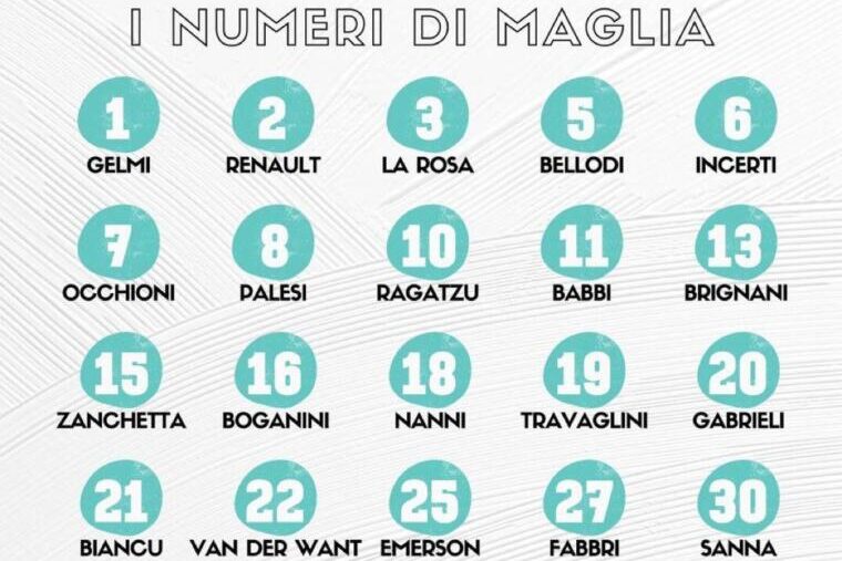 Si parte dalla certezza, la numero 10 affidata ancora una volta a Daniele Ragatzu. Cambia numero invece Roberto Biancu che passa al 21. In avanti Babbi ha scelto la numero 11, Nanni la 18 mentre Gianluca Contini ha scelto la 32. Emerson guiderà la difesa con la casacca numero 25, il rientrante Bellodi ha deciso invece di optare per il 5. Joseph Minala inizierà la sua avventura in maglia bianca con il 58, Sueva invece ha scelto la 79. Tra i più giovani, Secci ha scelto la 33, già avuta ai tempi della Primavera del Cagliari, Konig ha deciso per la 76 e Incerti ha scelto invece la numero 6. Il numero 1 sarà sulle spalle del nuovo arrivato Gelmi, mentre Van Der Want avrà la 22. Nella grafica la lista completa.