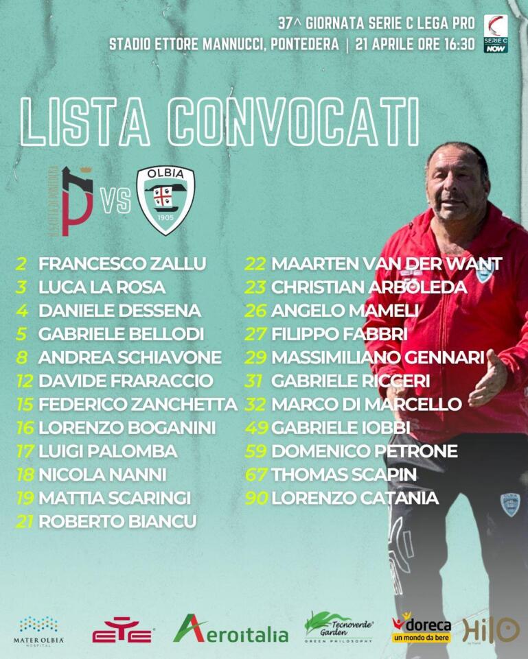 Obbligatorio vincere per i galluresi che affronteranno però i toscani dell’ex Max Canzi con una rosa decimata da infortuni e squalifiche. Non saranno infatti della partita il portiere Rinaldi e il difensore Motolese, entrambi alle prese con dei risentimenti muscolari. Oltre a loro peseranno le assenze per squalifica con Ragatzu, Montebugnoli e Bianchimano obbligati allo stop dal giudice sportivo. Di seguito, nella grafica, i convocati di Oberdan Biagioni per la gara contro il Pontedera.