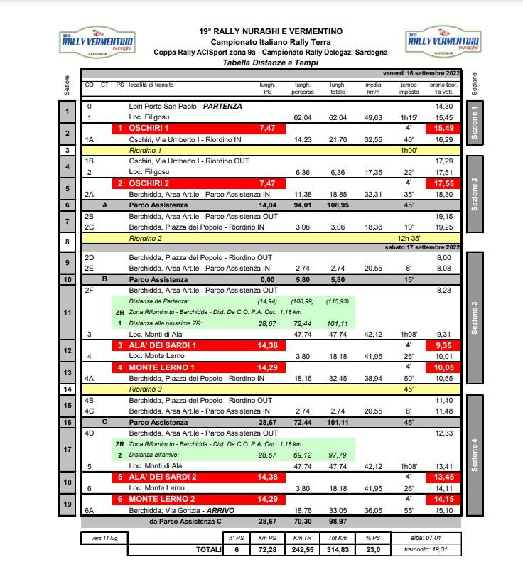 La gara organizzata dalla Rassinaby Racing รจ a calendario per il 16 e 17 settembre e sarร una prova chiave della combattuta serie dedicata agli sterrati tricolori. Quasi 73 i chilometri di prove cronometrati per un totale di 315 km di gara che infiammeranno il Nord Sardegna. Si parte venerdรฌ 16 settembre dall’ormai tradizionale cornice di Loiri Porto San Paolo alle ore 14:30, poi la prima vettura raggiungerร la prima prova speciale da ripetere due volte in rapida successione alle ore 15:49. La Oschiri รจ il primo snodo della gara con i suoi 7,47 km che apriranno le danze al venerdรฌ che fa da preludio a un sabato davvero impegnativo. Da percorrere infatti i due passaggi su tratti che hanno fatto parte del mondiale rally con le prove di Alร dei Sardi e Monte Lerno (entrambe di circa 14 km, da ripetere due volte) che decreteranno i nuovi re del Vermentino. Arrivo e premiazione a Berchidda, cuore pulsante della manifestazione, alle ore 15:10.