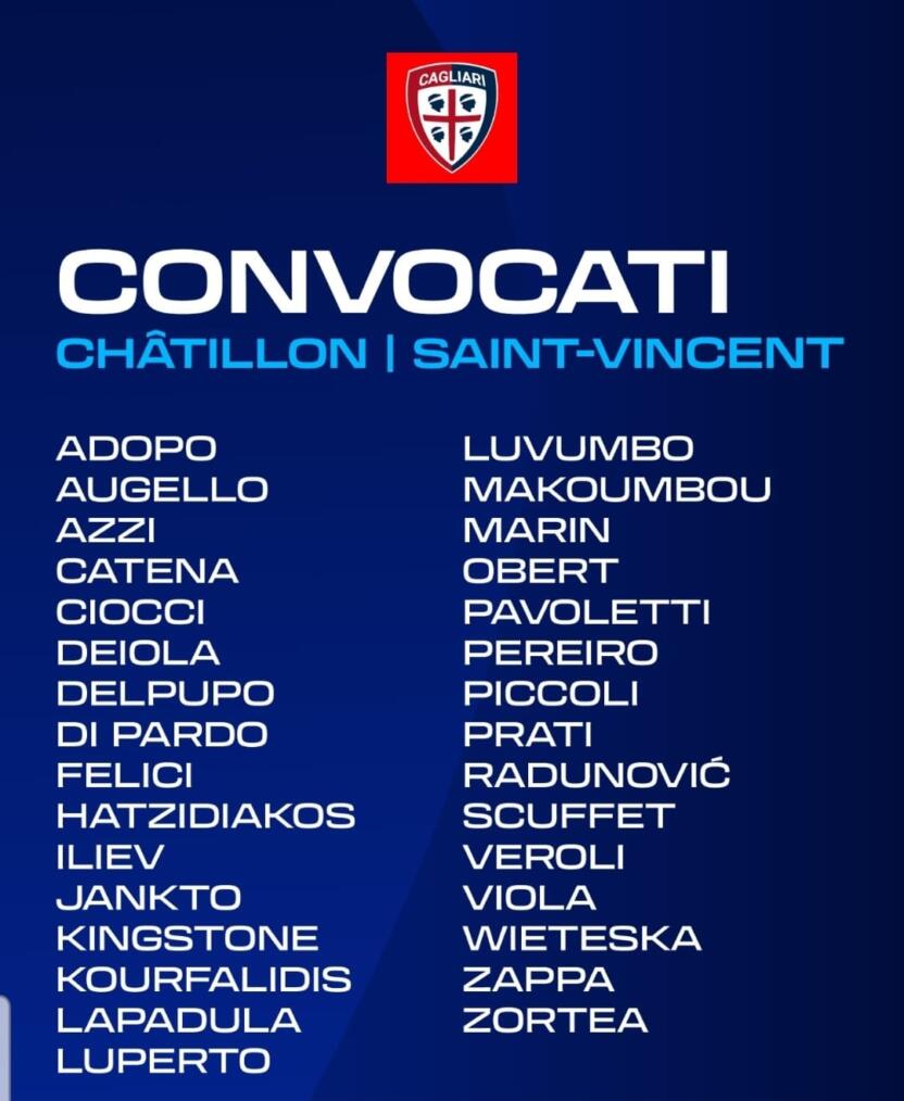 Tornano parte dei Nazionali per la seconda parte di ritiro del Cagliari in Valle d’Aosta: il club rossoblù ha diramato la lista che sarà a disposizione di Davide Nicola per le due settimane di Chatillon e Saint-Vincent che si concluderanno con l’amichevole con il Modena.