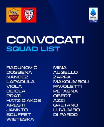 Sono 23 i convocati da Claudio Ranieri per la partita che chiuderร il 22ยฐ turno della Serie A, il monday night tra Roma e Cagliari.