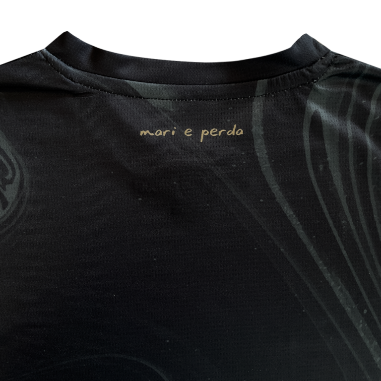 Il giromanica è decorato con un dettaglio in oro. La manica destra, invece, presenta un’applicazione con silicone che richiama il prezioso filo dorato del Bisso, ottenuto dalla Pinna Nobilis e che viene utilizzato, fin dai tempi antichi, per i ricami artigianali sardi. Sul retro del colletto è presente la scritta“Mari e Perda”, simbolo di tenacia e forza, con il mare che rappresenta la resistenza e la pietra ossidiana che invece è simbolo di forza e malleabilità. All’interno del colletto, infine, ecco il tergisudore personalizzato con le scritte “Cagliari Calcio” e “EYE Sport” mentre sul fine maglia c’è la scritta “Casteddu e Mari e Perda”, omaggio all’orgoglio della Sardegna.