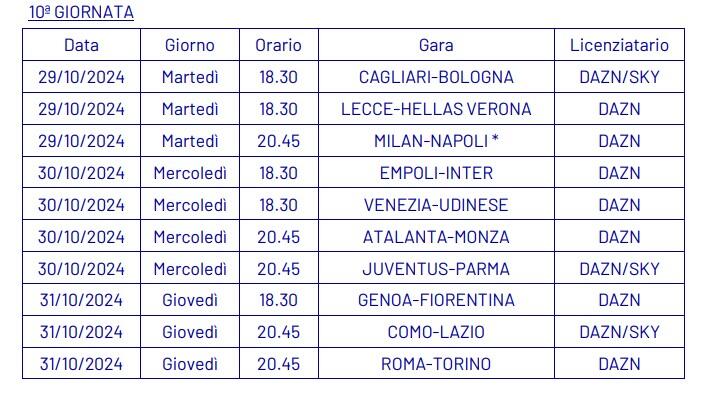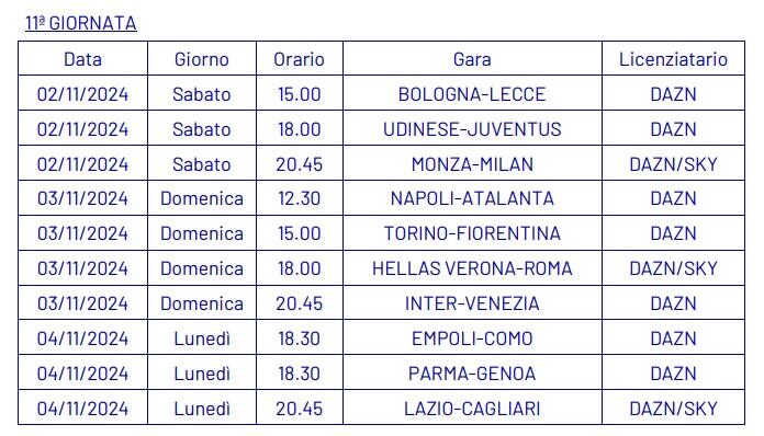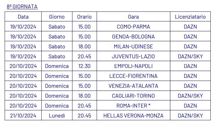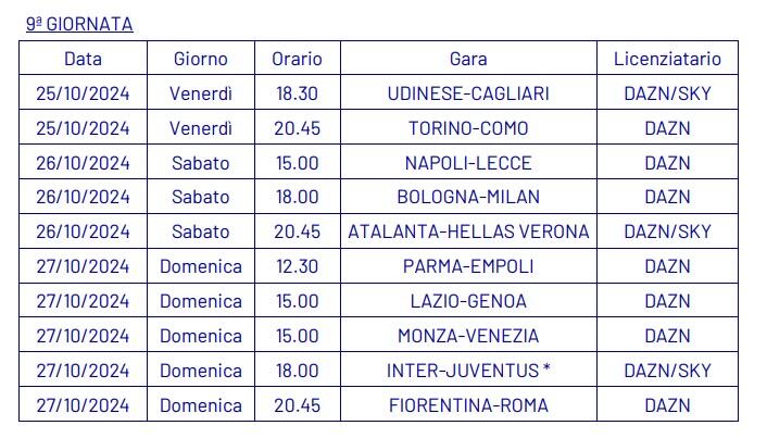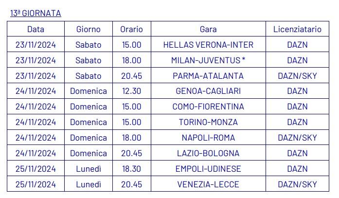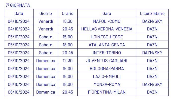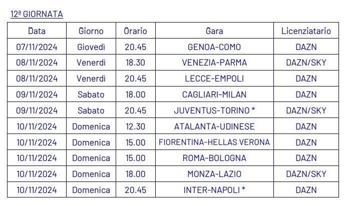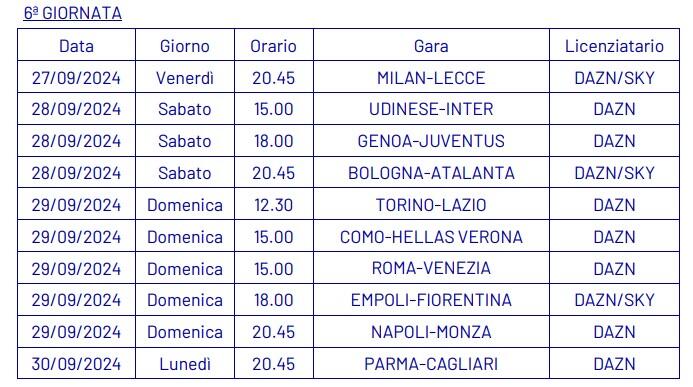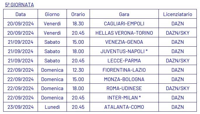 Dopo aver ufficializzato nella giornata di ieri, martedì 3 settembre, le date e gli orari della quarta giornata di campionato (qui l’articolo completo), la Lega Serie A ha annunciato anche le date e gli orari dal quinto al tredicesimo turno della Serie A 2024-2025.