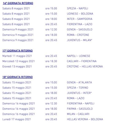Per quanto riguarda la squadra rossoblรน la cruciale partita con il Benevento sarร disputata nel canonico orario delle 15:00 di domenica: il turno successivo (infrasettimanale) vedrร l’anticipo del mercoledรฌ delle 18:30 per l’undici di Semplici impegnato alla Sardegna Arena contro la Fiorentina. Schedulata anche la penultima giornata di campionato contro il Milan: a San Siro si giocherร domenica 16 maggio alle ore 20:45. Da stabilire ovviamente ancora gli orari dell’ultimo turno in base alla contemporaneitร delle gare che vedranno impegnate le squadra che lottano per la Champions o la salvezza. Il quadro completo: