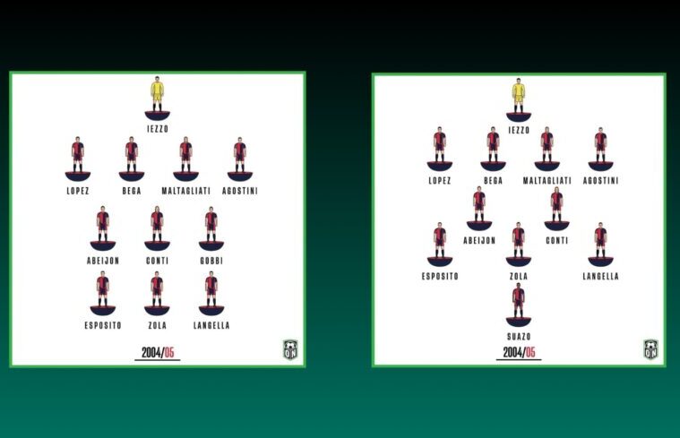 Due versioni, una con il classico 4-3-3 con il tridente formato da Zola, Esposito e Langella, insieme a un ultraoffensivo 4-2-3-1 con il trio alle spalle di David Suazo. È l’omaggio che Operazione Nostalgia, realtà editoriale nata per esaltare i decenni d’oro della Serie A italiana come i Novanta e primi Duemila, ha voluto tributare al Cagliari del 2004-05, quello con Daniele Arrigoni in panchina e che tante soddisfazioni seppe regalare ai tifosi rossoblù. “Abbiamo scelto proprio quel Cagliari – ci racconta Nando Di Giovanni, coordinatore editoriale di Serie A-Operazione Nostalgia – perché rappresenta la summa di tutti i valori che noi, abitanti del Continente, ascriviamo ai rossoblù. Ossia l’attaccamento alla maglia di Zola, il fatto di aver conquistato e difeso la Serie A con il duo di esterni formato da Mauro Esposito e ‘Arrogutottu’ Langella, due ragazzi senza pedigree che si fanno strada nel calcio italiano di quegli anni. O Suazo, la promessa sempre sul punto di esplodere che finalmente riesce a far vedere di essere un attaccante di valore anche in Serie A, così come Daniele Conti che riesce a togliersi di dosso l’etichetta di ‘figlio di Bruno’, trovando una propria consacrazione. Insomma, tutti elementi che certamente hanno suscitato tanta simpatia anche in chi non è tifoso del Cagliari”.