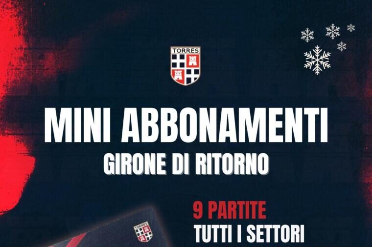 Alla luce delle presenze allo stadio delle ultime gare interne, in vista del girone di ritorno la Torres ha pensato di proporre ai suoi tifosi un mini abbonamento per sostenere dal vivo la squadra di Alfonso Greco. Un carnet di 9 partite casalinghe al Vanni Sanna (più 2 in omaggio) al prezzo di 150 euro: dalle 17 di oggi, lunedì 16 dicembre, sarà possibile acquistare i mini abbonamenti (anche in versione gift card) sia online che nel Torres Store del centro commerciale Tanit.