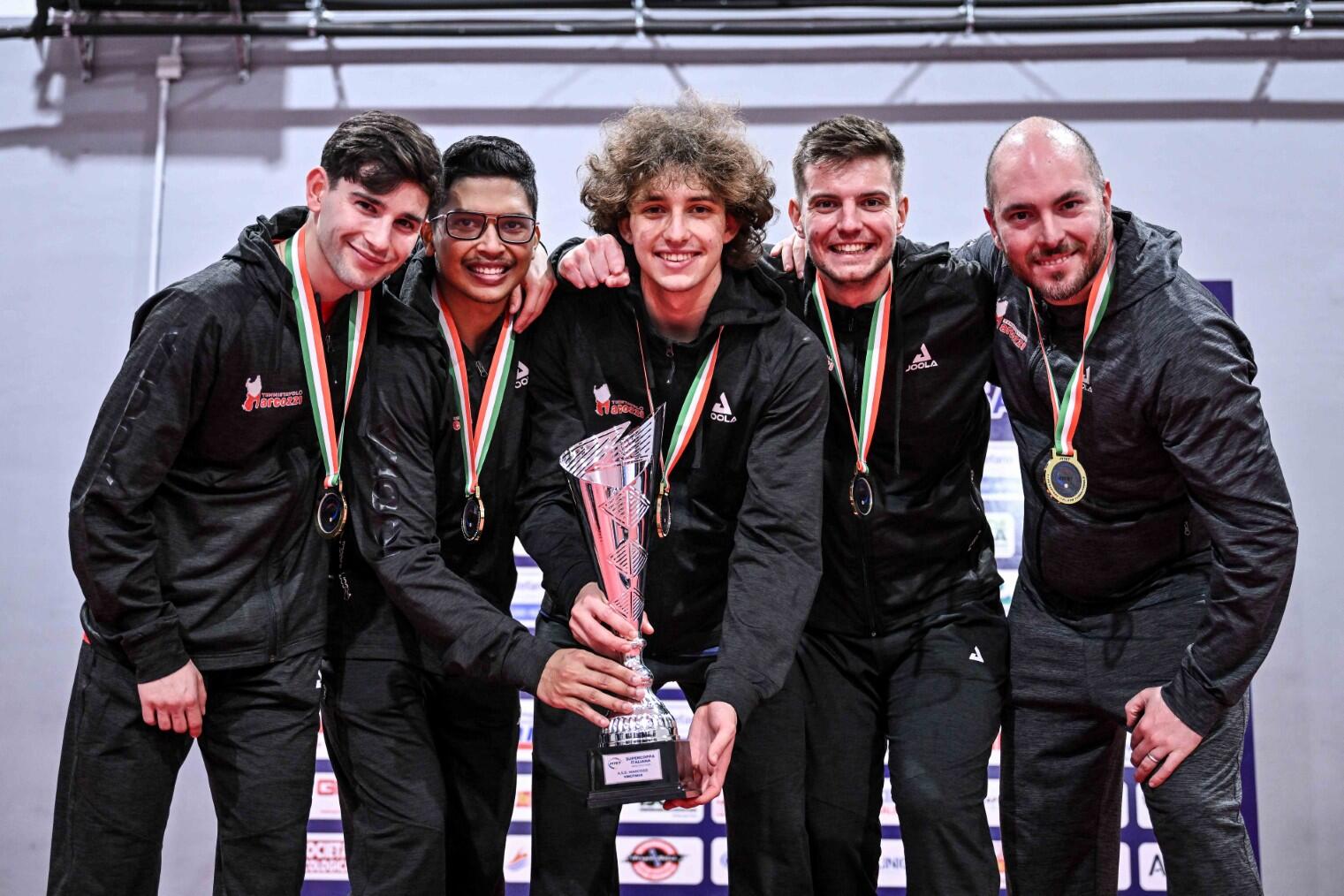 La Marcozzi Cagliari festeggia la conquista della Supercoppa italiana superando nel derby i campioni d’Italia del Tennistavolo Sassari: la Marcozzi haย avuto la meglio in rimonta, con la formula a staffetta, per 36-45, 45-44, 45-38 e ha ricevuto il trofeo dalle mani del vicepresidente vicario della FITeT Carlo Borella e del consigliere federale Raffaele Curcio.